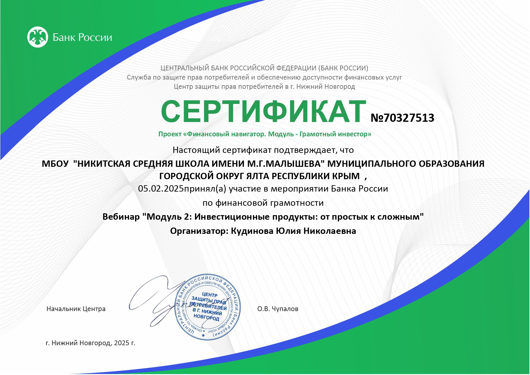 Организатор онлайн-урока педагог финансовой грамотности Кудинова Юлия Николаевна