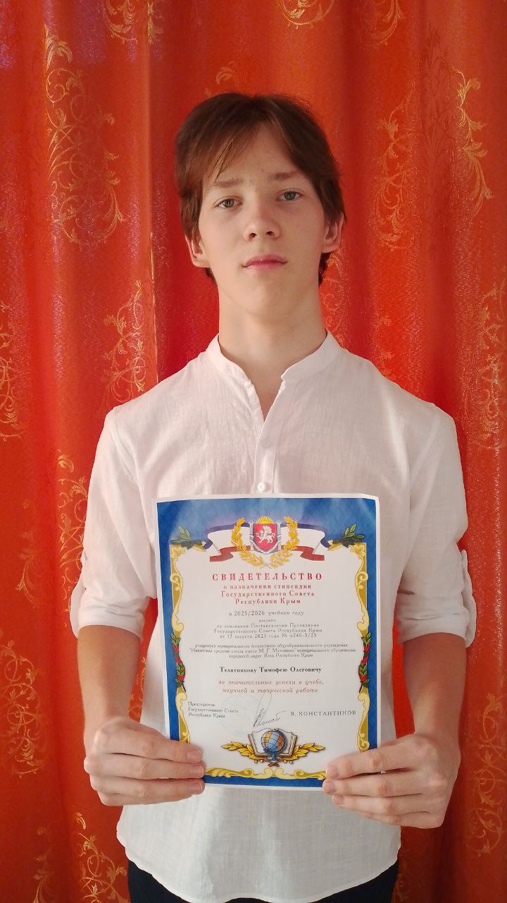 Свидетельство о назначении стипендии Государственного Совета Республики Крым в 2025-2026 учебном году получил ученик 11 класса - Телятников Тимофей