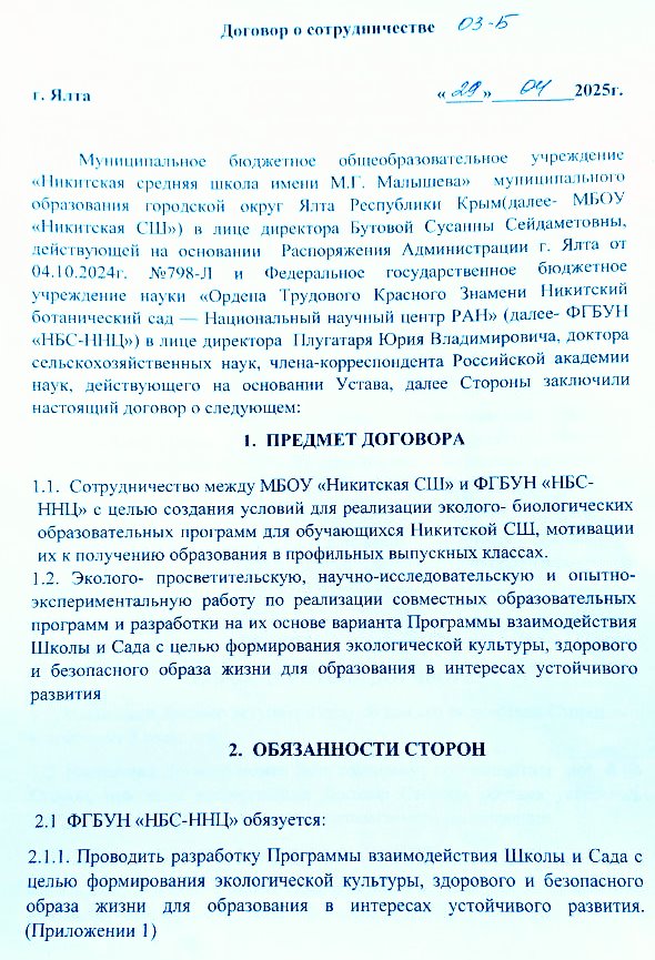 Муниципальное бюджетное общеобразовательное учреждение «Никитская средняя школа» заключила соглашение о сотрудничестве с федеральным государственным бюджетным учреждением науки «Научно-ботанический сад Научного центра Российской академии наук». Целью данного соглашения является создание оптимальных условий для организации и проведения эколого-биологических занятий, направленных на формирование экологической грамотности, обеспечение здоровьесберегающего и безопасного образа жизни обучающихся, а также развитие научных исследований и экспериментальной деятельности в рамках образовательных программ согласно утвержденному варианту совместной работы школы и ботанического сада в целях обеспечения устойчивого экологического воспитания подрастающего поколения.