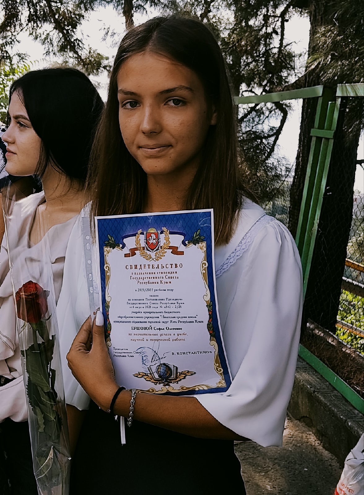 Свидетельство о назначении стипедии Государственного Совета Республики Крым в 2021-2022 учебном